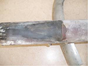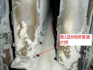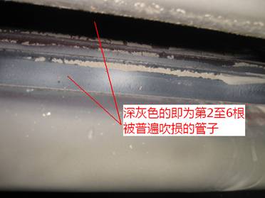 ¢ÛµÍÎÂÔÙÈÈÆ÷´µ»ÒÆ÷ÉÏ·½µÚ2-6¸ù¹Ü×Ó£¬´µ»ÒÆ÷Ï·½µÚ2-3¸ù¹Ü×ӯձ鱻´µ»ÒÕôÆû´µË𣬽ÏÑÏÖØµÄ²ÐÓà±Úºñ½ö1.0mm£¬²¢Í¬Ñù¾ßÓмÌÐøÀ©Õ¹ÖÁÆäËû¹Ü×ÓµÄÇ÷ÊÆ£¬Í¼4¼´ÃèÊöÁ˼ìÐÞµ±Ê±µÄÏÖ³¡´µËðÇé¿ö£¬Æä¾ßÌ岿λÒàÈçͼ1ÖÐÐòºÅ5¡¢6¡¢8¡¢11Ëùʾ¡£